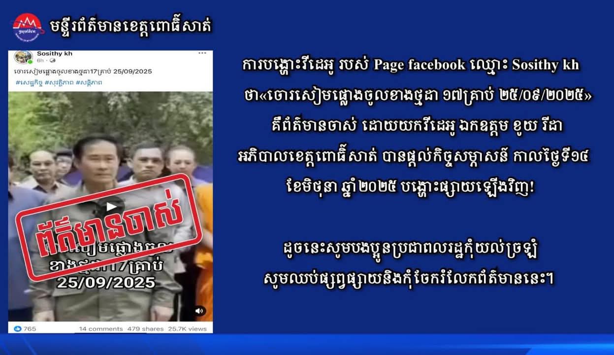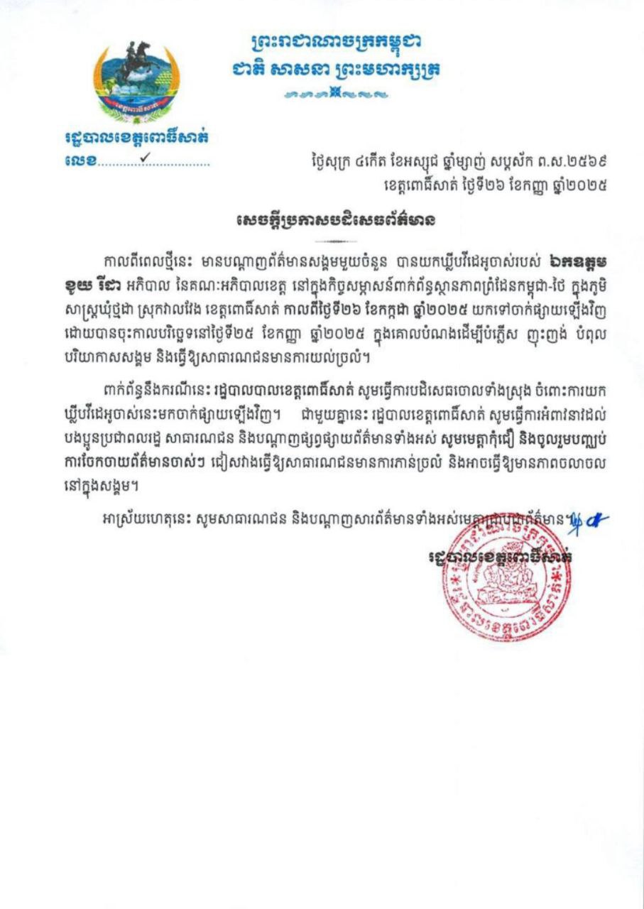 រដ្ឋបាលខេត្តពោធិ៍សាត់|សេចក្តីប្រកាសបដិសេធព័ត៌មាន. ព័ត៌មានជាតិ ដោយ អាស៊ាន ដេលី ថ្ងៃទី 26 ខែ ខែកញ្ញា ឆ្នាំ 2025 37 ផ្សាយ:ថ្ងៃទី២៦ ខែកញ្ញា ឆ្នាំ២០២៥ ដោយ:សៅ វាសនា(HarryVS) 37 ចែករំលែក