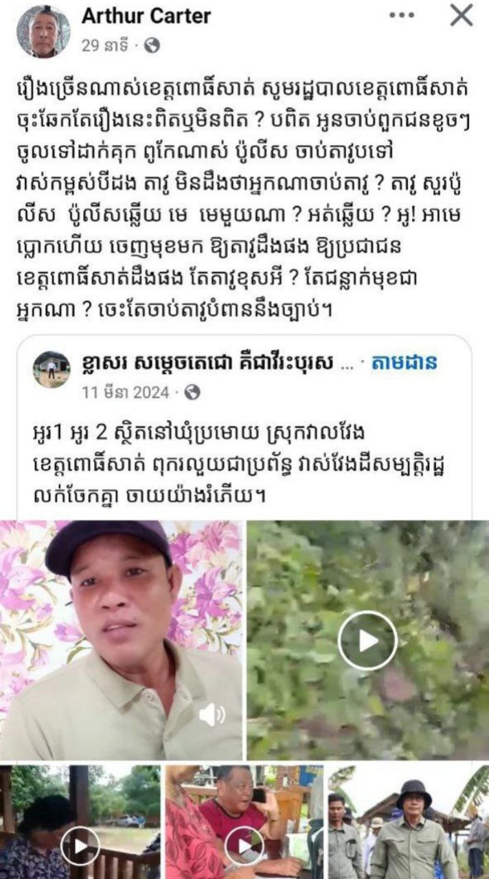 រដ្ឋបាល​ខេត្ត​ពោធិ៍សាត់​|សេចក្តី​បំភ្លឺ​ព័ត៌មាន​ ចំពោះ​គណនីហ្វេសបុកឈ្មោះ Arthur Carter បានធ្វើការស៊ែរ (Share) ឡើងវិញនូវ ព័ត៌មានដែលគណនីហ្វេសបុកផេកឈ្មោះ ខ្លាសរ សម្តេចតេជោ គឺជាវីរៈបុរសសន្តិភាព កាលពីថ្ងៃទី១១ ខែមីនា ឆ្នាំ២០២៤ បានធ្វើការចុះផ្សាយព័ត៌មានដែលមានចរិតបង្កាច់បង្អួច និងវាយប្រហារមកលើសមត្ថកិច្ច និងអាជ្ញាធរ ពាក់ព័ន្ធនឹងបទល្មើសទន្ទ្រានដីរដ្ឋនៅក្នុងភូមិសាស្ត្រស្រុកវាលវែង ខេត្តពោធិ៍សាត់ ដែលធ្វើឱ្យសាធារណ មតិអាច មានការយល់ភាន់ច្រលំ។