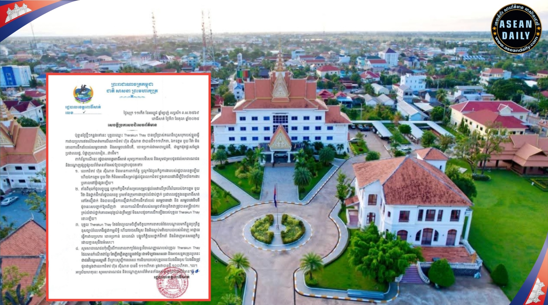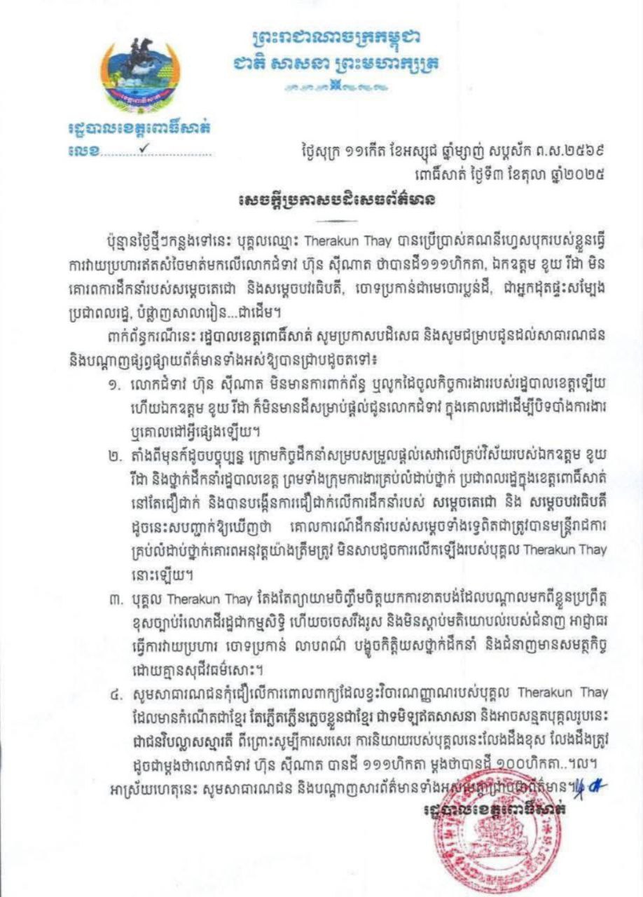 រដ្ឋបាលខេត្តពោធិ៍សាត់|សេចក្តីប្រកាសបដិសេធព័ត៌មានចំពោះម្ចាស់គណនីហ្វេសប៊ុកឈ្មោះ Therakun Thay បានប្រើប្រាស់គណនីហ្វេសបុករបស់ខ្លួនធ្វើ ការវាយប្រហារឥតសំចៃមាត់មកលើលោកជំទាវ ហ៊ុន ស៊ីណាត ថាបានដី១១១ហិកតា, ឯកឧត្តម ខូយ រីដា មិន គោរពការដឹកនាំរបស់សម្តេចតេជោ និងសម្តេចបវរធិបតី, ចោទប្រកាន់ជាមេចោរប្លន់ដី, ជាអ្នកដុតផ្ទះសម្បែង ប្រជាពលរដ្ឋ, បំផ្លាញសាលារៀន…ជាដើម។