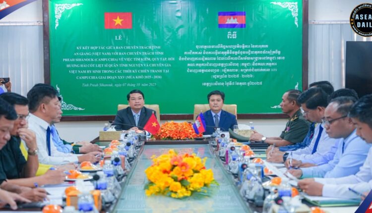 (ខេត្ត​ព្រះសីហនុ)​: នារសៀលថ្ងៃទី៧ ខែតុលា ឆ្នាំ២០២៥ លោក សុខ ភា អភិបាលរងខេត្តព្រះសីហនុ​តំណាងដ៏​ខ្ពង់ខ្ពស់​ ឯកឧត្តម​ ម៉ាង​ស៊ីណេត​ អភិបាល​ខេត្ត និងលោក ឡេង ទ្រុងហូ អនុប្រធាន គណៈកម្មាធិការប្រជាជនខេត្តអានហ្សាង បានដឹកនាំកិច្ចប្រជុំ និង ចុះហត្ថលេខាលើកំណត់ហេតុ ស្តីពីការរុករក ការជីកគាស់ ការធ្វើ មាតុភូមិ និវត្តន៍នូវអដ្ឋិធាតុកងទ័ពស្ម័គ្រចិត្ត និងជំនាញការ វៀតណាម ដែលពលីកាលពីសម័យ សង្គ្រាមនៅកម្ពុជា សម្រាប់ ដំណាក់កាលXXV (រដូវប្រាំងឆ្នាំ២០២៥-២០២៦) រវាងខេត្ត ព្រះសីហនុ និងខេត្តអានហ្សាង​ កិច្ចប្រជុំធ្វេីឡេីងនៅក្នុងក្រុមប្រឹក្សាសាលាខេត្តជាន់ទី១ ស្ថិតនៅក្នុងសង្កាត់៣ ក្រុងព្រះសីហនុ​ដោយមានការចូលរួមពីសំណាក់​ មេបញ្ជាការ​សឹងរងខេត្តព្រះសីហនុ លោកនាយកទីចាត់ការទំនាក់ទំនងសាធារណ: និងទំនាក់ទំនងប្រតិបត្តិការអន្តរជាតិខេត្ត ស្នងការរង​ខត្តឯ​មេបញ្ជាការ​រងប៉េអុឹមខេត្ត តំណាង​អភិបាលរង​ក្រុង​-ស្រុក​ អគ្គរាជទូតវៀតណាម និងមន្ត្រីស្ថានទូតប្រចាំខេត្តព្រះសីហនុជាច្រេីនរូបទៀត.